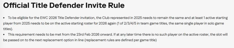 要符合2026年EWC冠军卫冕邀请资格,该选手2025年所代表的俱乐部须保持不变,且至少有一名2025年冠军的现役首发选手再次出现在2026年的首发名单中。